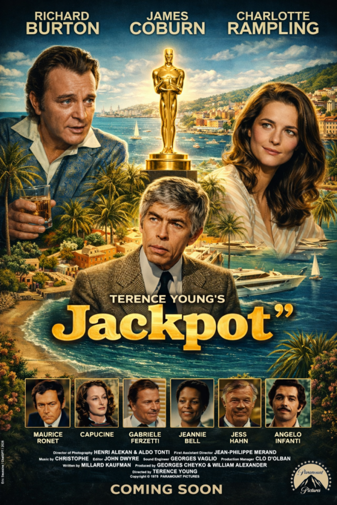 Jackpot est un film inachevé qui fut tourné entre décembre 1974 et mai 1975, dans le sud de la France au Studio de la Victorine, célèbre pour son patrimoine cinématographique centenaire et pour son emplacement idyllique sur la Côte d’Azur qui a su attirer des artistes du monde entier.